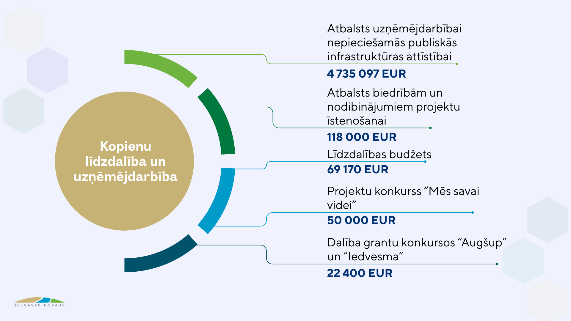 Pašvaldība turpinās atbalstīt iedzīvotāju iniciatīvas, gādājot par līdzdalības iespējām. Aizvadītā gada izskaņā uzsākta līdzdalības budžeta projektu realizācija, kas iedzīvotāju līdzdalības veicināšanai pašvaldībā īstenota pirmo reizi. Kopējais Jelgavas novada pašvaldības 2025. gada līdzdalības budžets bija 35 000 eiro. Šogad turpināsies konkursā apstiprināto projektu īstenošana. 2026. gada budžetā līdzdalības budžeta īstenošanai piešķirti vairāk nekā 104 000 eiro, proti, pērn neiztērētais līdzdalības budžeta finansējums 35 000 eiro un 2026. gadā plānotais finansējums – 69 170 eiro.