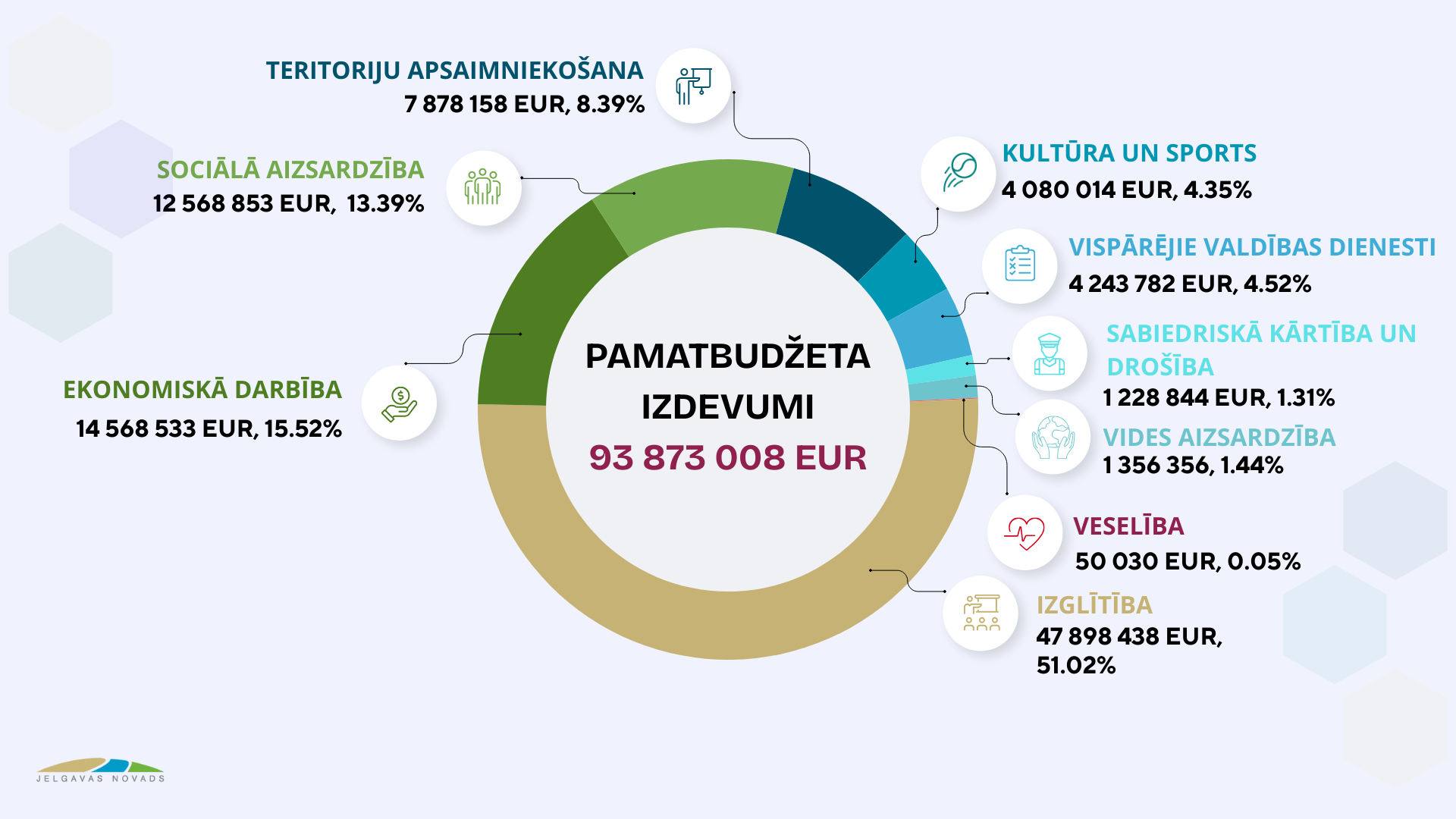 Atbilstoši funkcionālajām kategorijām pašvaldības pamatbudžeta izdevumi plānoti 93 873 008 eiro apjomā jeb 2 853,54 eiro uz vienu Jelgavas novada iedzīvotāju. Kā ik gadus – ievērojamākais izdevumu apjoms pašvaldības pamatbudžetā paredzēts izglītības nozarei, tai atvēlot 51,02% no kopējiem pamatbudžeta izdevumiem jeb 47 898 438 eiro. Šogad plānots veikt nozīmīgus ieguldījumus izglītības jomā un mācību vides uzlabošanā, īstenojot gan vairākus ilgstoši gaidītus infrastruktūras attīstības projektus, gan turpinot jau iesāktos izglītības iestāžu labiekārtošanas un remontdarbus, kā arī veicot informācijas tehnoloģiju aprīkojuma atjaunošanu un papildināšanu. 2026. gadā plānots uzsākt Svētes pamatskolas piebūves projekta īstenošanu un Ozolnieku vidusskolas četru STEM mācību kabinetu pārbūvi un aprīkošanu, tiks uzsākti projektēšanas darbi Elejas vidusskolas sporta hallei, Kalnciema pamatskolas sporta laukumam un Ozolnieku vidusskolas stadionam, kā arī iecerēts organizēt metu konkursus Aizupes pamatskolas un Ozolnieku vidusskolas piebūvēm. Savukārt Staļģenes pamatskolā, Vircavas pamatskolā un Vircavas pamatskolas Platones filiālē noslēgsies pērn uzsāktie darbi, nodrošinot mūsdienīgu mācību vidi un veicinot kvalitatīvas izglītības ieguvi. Tāpat tiks pabeigta Elejas vidusskolas mājturības un tehnoloģiju darbnīcas telpu renovācija. Īpaši tiek domāts par skolēnu pārvadājumu uzlabošanu – lai nodrošinātu ērtāku un drošāku nokļūšanu uz izglītības iestādēm, jaunu autobusu, kas tiks nodoti Elejas, Jaunsvirlaukas, Ozolnieku un Valgundes pagasta rīcībā, iegādei paredzēti 1 300 000 eiro.
