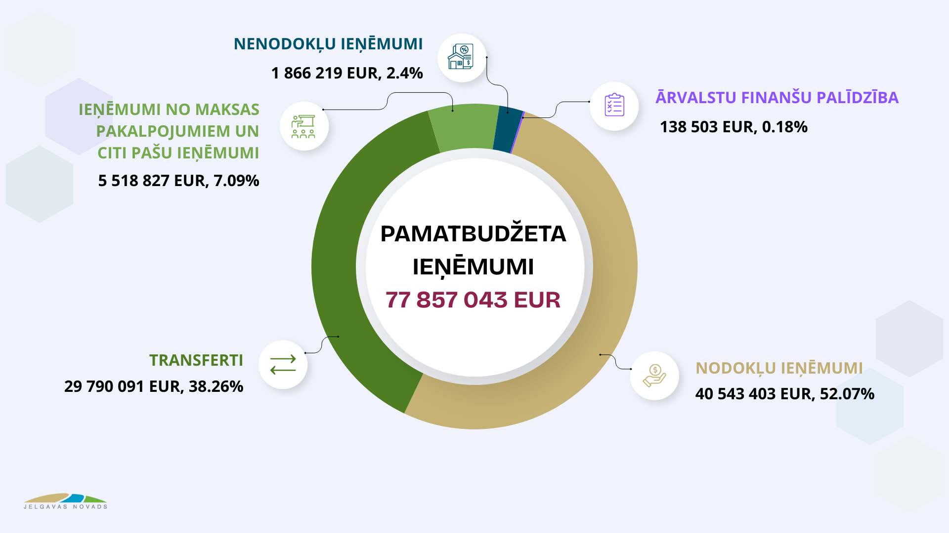 Saskaņā ar domes lēmumu Jelgavas novada konsolidētā budžeta ieņēmumu kopējais apjoms 2026. gadā prognozēts 77 857 193 eiro apmērā, tajā skaitā pamatbudžeta ieņēmumi – 77 857 043 eiro, ziedojumu budžeta ieņēmumi – 150 eiro, izdevumu kopējais apjoms – 93 885 530 eiro apmērā, tajā skaitā pamatbudžeta izdevumi – 93 873 008 eiro un ziedojumu budžeta izdevumi – 12 524 eiro. Pamatbudžeta izdevumu pārsniegumu pār ieņēmumiem 16 015 965 eiro apmērā un uzņemto saistību atmaksu 2 213 981 eiro apmērā paredzēts finansēt no budžeta līdzekļu atlikuma šī gada sākumā – 9 963 539 eiro un Valsts kases aizņēmuma piesaisti – 9 313 947 eiro apmērā, vienlaikus paredzot naudas atlikumu uz gada beigām 1 047 540 eiro. Ziedojumu izdevumu pārsniegums pār ieņēmumiem tiks finansēts no ziedojumu naudas atlikuma uz gada sākumu – 12 374 eiro.