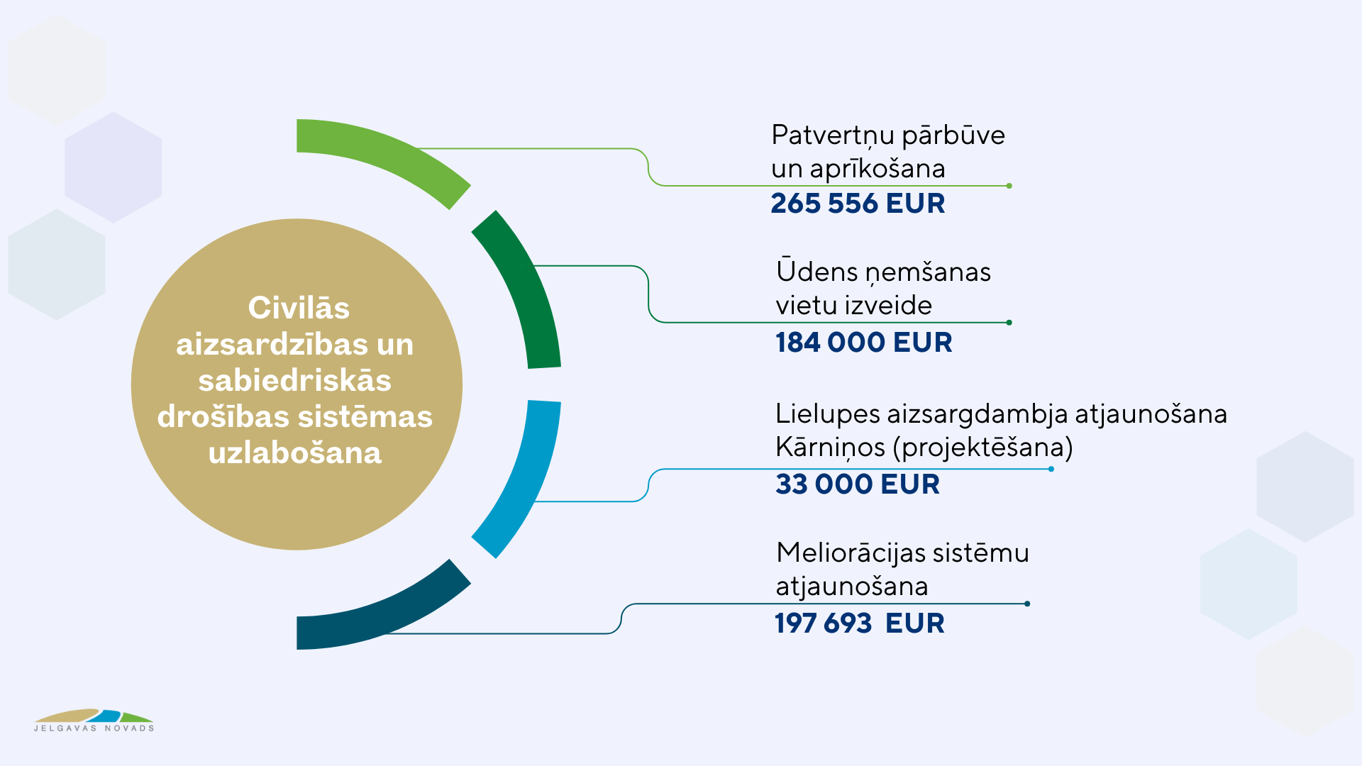 Meliorācijas sistēmu sakārtošanai – caurteku nomaiņai, grāvju tīrīšanai un atjaunošanai, apauguma noņemšanai, nogāžu stiprināšanai plānoti 230 693 eiro. Savukārt projekta ietvaros, piesaistot ERAF fonda finansējumu, iedzīvotāju aizsardzībai no bīstamiem faktoriem katastrofas, militāra iebrukuma vai kara gadījumā, mazinot ārēja sprādziena triecienviļņa un šķembu ietekmi, par 358 257,20 eiro plānots pielāgot patvertņu vajadzībām astoņus pašvaldībai piederošu objektus – Ānē, Elejā, Emburgā, Kalnciemā, Ozolniekos, Nākotnē, Vilcē un Vircavā.