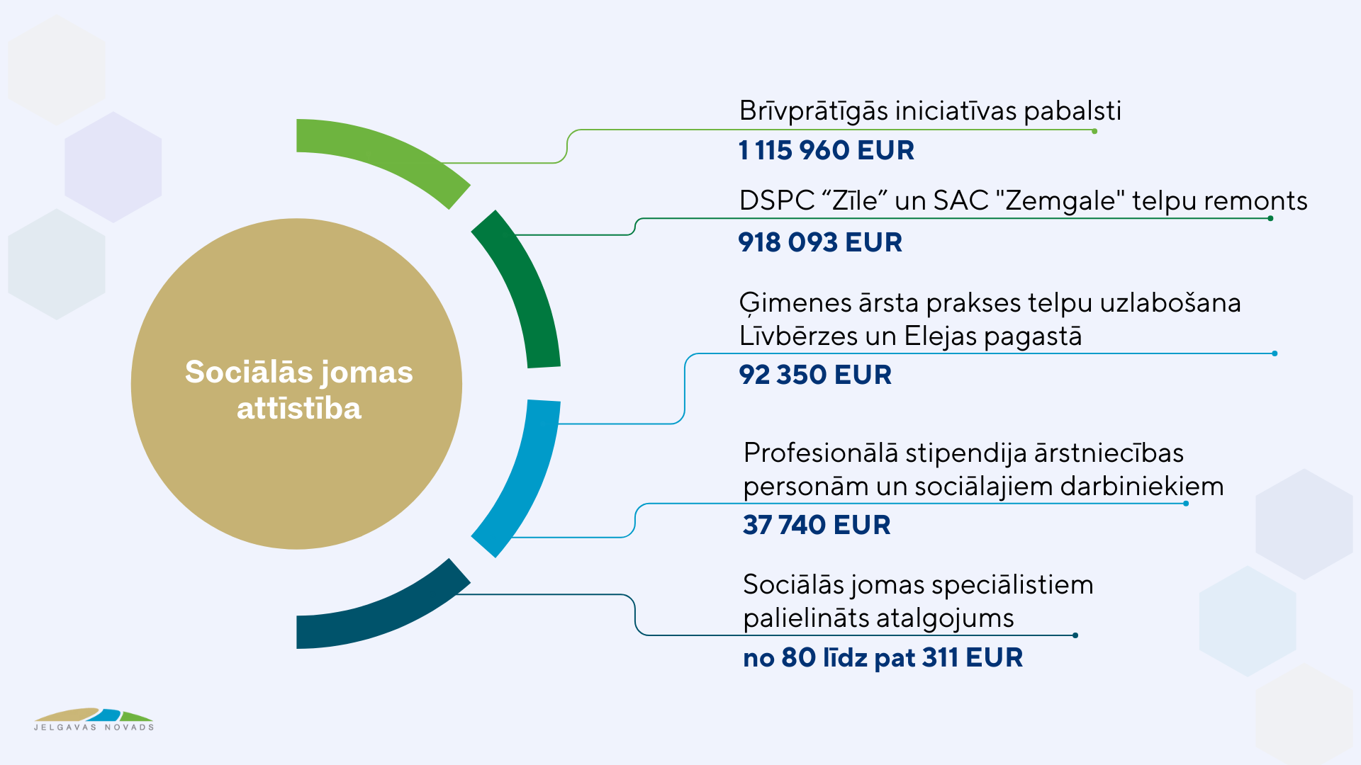 Sociālās aizsardzības jomā, sekojot iedzīvotāju vajadzībām, plānots uzsākt jaunu atbalsta programmu – sociālā rehabilitācija personām ar kognitīviem traucējumiem jeb demenci. Lai nodrošinātu kvalitatīvu veselības aprūpes pakalpojumu pieejamību pēc iespējas tuvāk dzīves vietai, tiks veikta ģimenes ārsta prakses telpu uzlabošana Līvbērzes un Elejas pagastā, kā arī turpināts atbalsts ārstniecības personām un ārstu praksēm Jelgavas novadā, pašvaldībai piešķirot atbalstu dzīvojamo telpu īres un apkures maksas vai viesnīcas numura īres daļējai kompensēšanai un ārstu prakses darbības nodrošināšanai. Ievērojami uzlabojumi klientu un darbinieku ērtību palielināšanai, kā arī sniegto pakalpojumu vides un kvalitātes uzlabošanai tiks veikti sociālās aprūpes centra ”Zemgale” B korpusā. Tāpat uzlabojumi iecerēti Daudzfunkcionālajā sociālo pakalpojumu centrā “Zīle”, lai paplašinātu sociālo pakalpojumu pieejamību personām ar garīga rakstura traucējumiem.