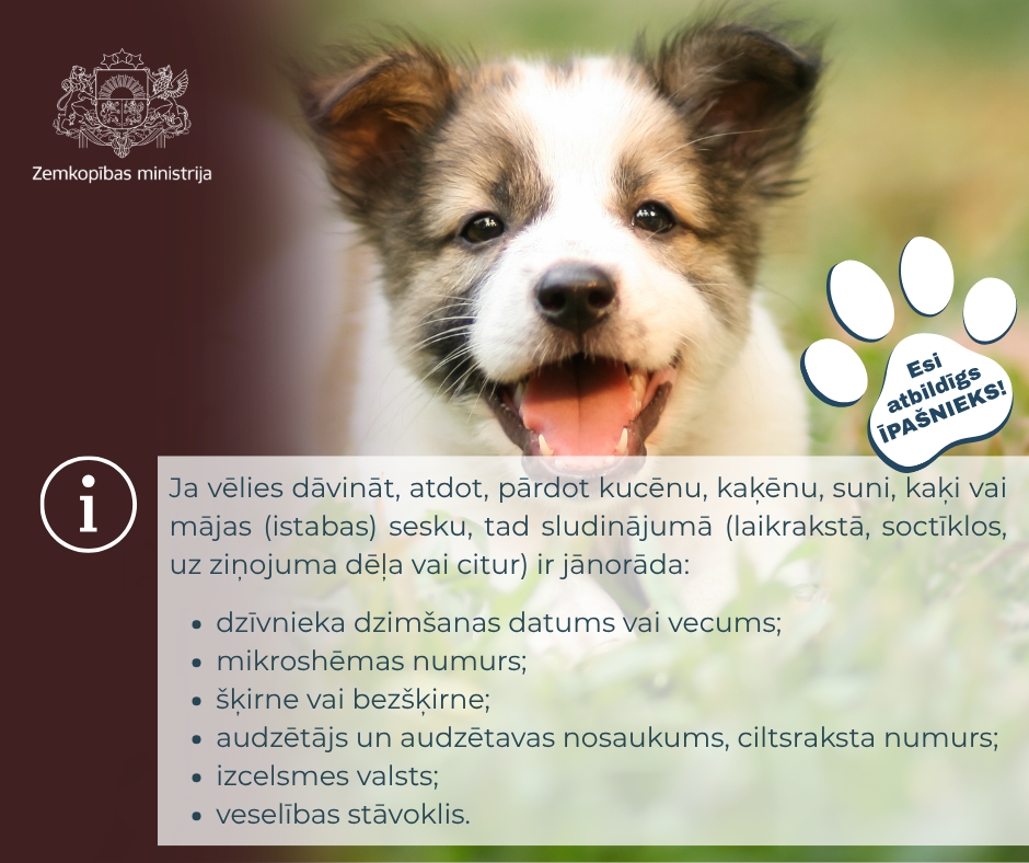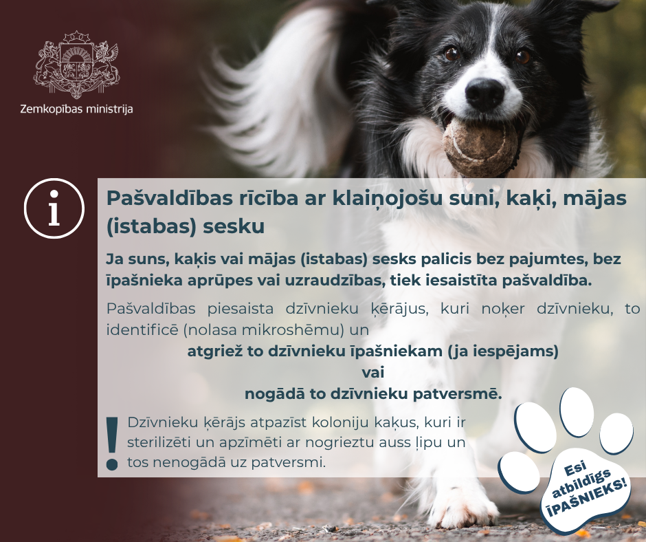 Zemkopības ministrija ir sagatavojusi informatīvus vizuālos materiālus “Esi atbildīgs dzīvnieka īpašnieks!”, lai veicinātu atbildīgu attieksmi pret mājdzīvniekiem. Aicinām iedzīvotājus iepazīties ar šiem materiāliem un ikdienā ievērot atbildīgas dzīvnieku turēšanas principus!