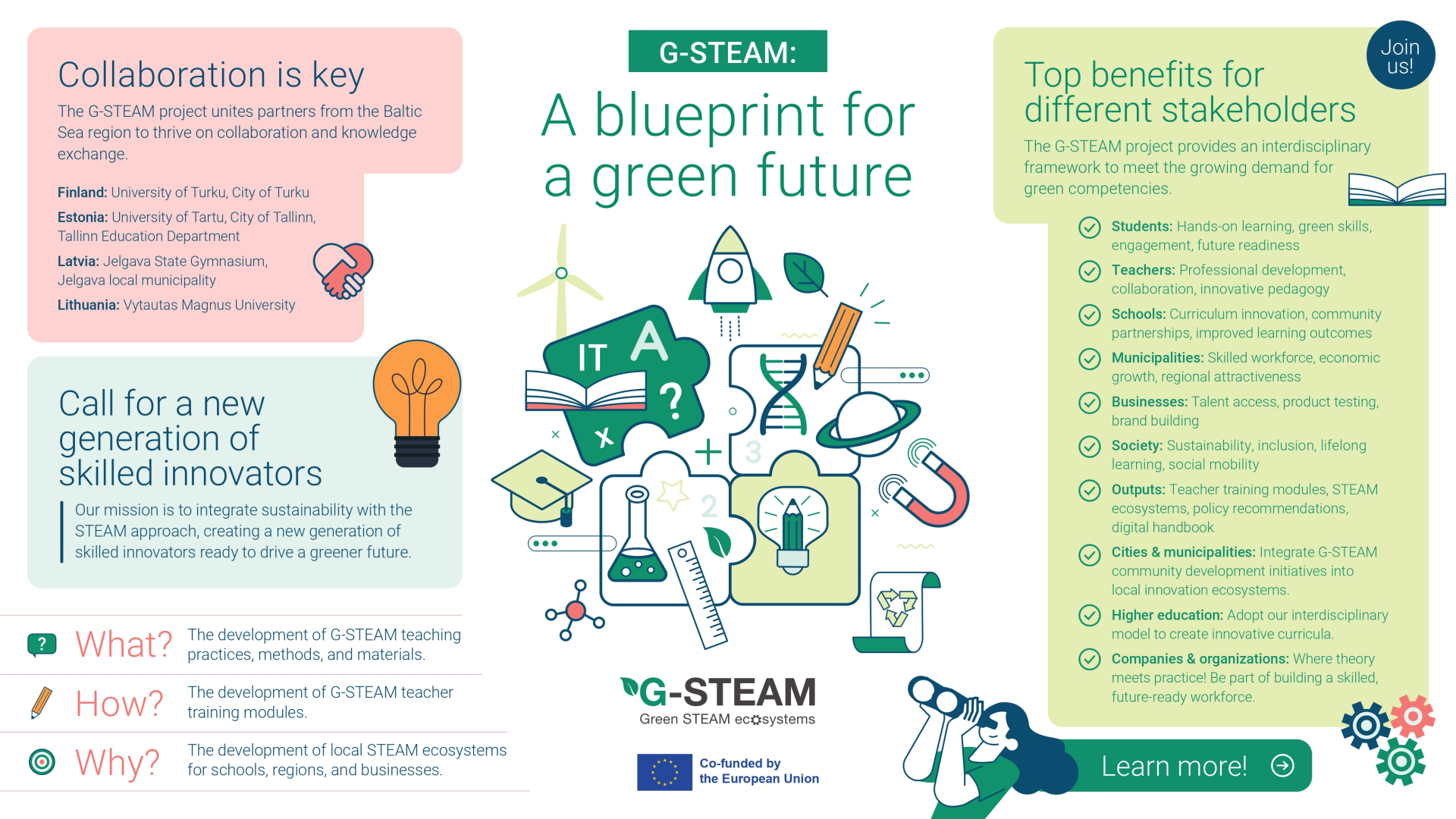 Projekta mērķis: Popularizēt STEAM pieejas izmantošanu mācību procesā, īpašu uzsvaru liekot uz “Zaļo STEAM” (uz nākotni orientēta STEAM izglītība, kas balstīta uz ilgtspējību un tīrām tehnoloģijām), kā arī izveidot vietējās STEAM ekosistēmas modeli, kurā ieinteresētās puses – skolas, pašvaldības, augstskolas, privātie uzņēmumi, arī nevalstiskā sektora dalībnieki, uz savstarpējas vienošanās pamata varēs brīvprātīgi iesaistīties, veidojot abpusēji izdevīgu, ilgtermiņa sadarbību.